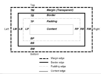 Allereerst is er de totale afmeting (hoogte en breedte - Margin edge) – alle andere blokken worden daar buiten geplaatst. Tussen de rand (border) en de totale afmeting is er een marge (margin) deze is transparant en heeft dus de kleur van de onderliggende laag. Deze marge kan op 0 worden gezet zodat de rand (border) ook de afmeting van het blok wordt. Standaard gebruikt html een marge voor blok elementen