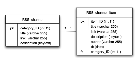 We gaan in dit voorbeeld uit van een zeer eenvoudige database met 2 tabellen. Tabel 1 bevat de hoofdinformatie van de verschillende RSS bestanden die we willen schrijven. De andere tabel heeft hiermee een relatie om de items weer te geven. Uiteindelijk willen we naar de structuur die weergegeven is in de RSS les.